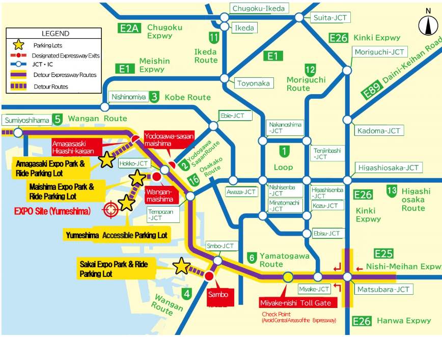 3.自行開車前往:請注意不得開私家車進入會場,必須停在Maishima, Amagasaki, or Sakai等地方,然後轉乘接駁巴士前往博覽會現場。(請點此)