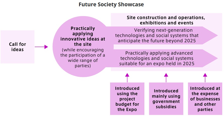 我們將根據世博會的概念「人民生活實驗室;未來社會的實驗室」實施一個未來社會展示項目,在此項目中,社會系統和尖端技術,如碳中和、數位科技和下一代通訊技術,將在會場內運用並融入活動運作和展覽中。此外,我們還將利用尖端技術,如擴增實境(AR)和虛擬實境(VR),舉辦虛擬博覽會,以便無法親臨現場的人們也能體驗博覽會。