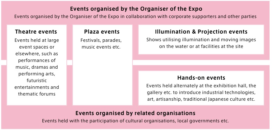我們將創造一個充滿活力和興奮的世博會,您可以享受真正的聲光娛樂效果,例如水世界的水上表演、會場設施和通道的投影映射、在活動廣場、活動廳及其他各種大小舞台舉辦的音樂和表演藝術活動、傳統表演藝術和流行文化的實作活動,以及來自日本各地的節慶和遊行,要將屬於日本正統的「盛情款待」傳遞給從世界各地遠道而來的貴賓們!