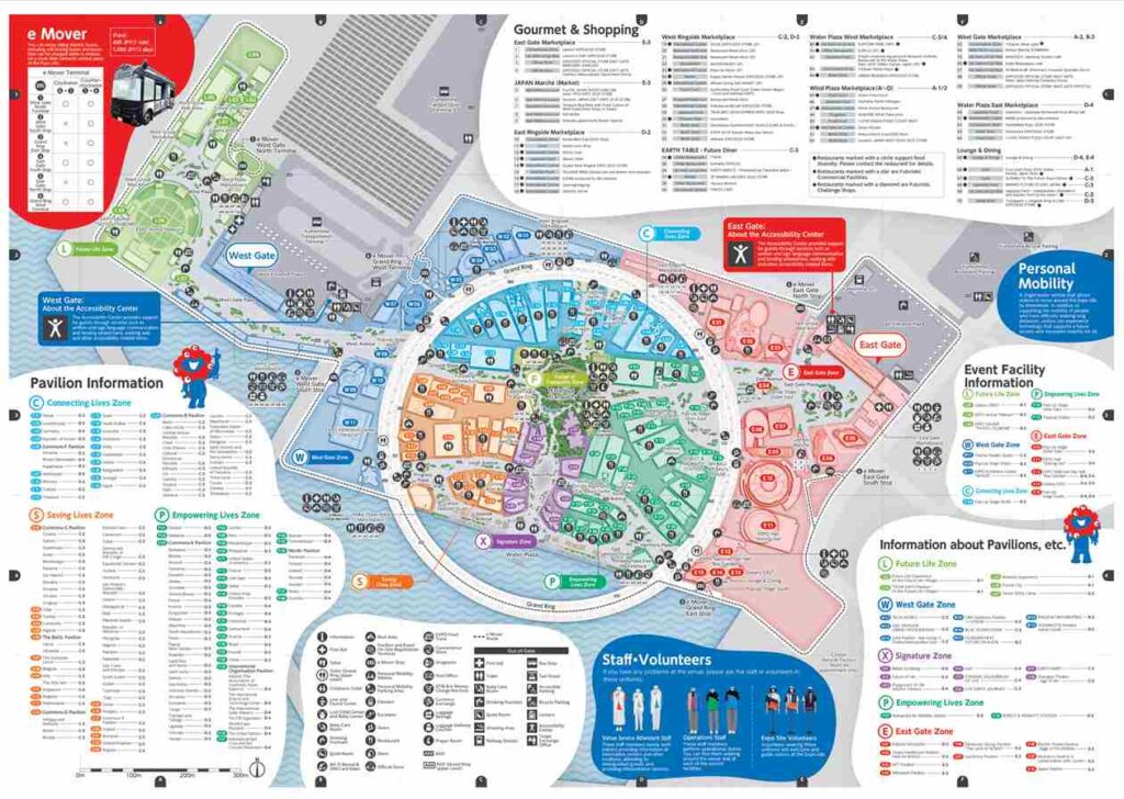 會場佔地155公頃,相當於33個東京巨蛋的大小。除了步行外,還有兩個移動方法: